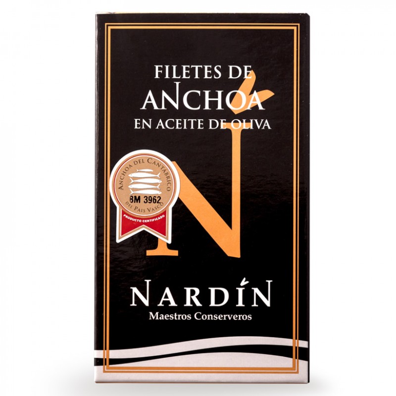 Filetes de anchoa en aceite de oliva. Lata 50 peso, neto 50 gramos, peso escurrido 29 gramos